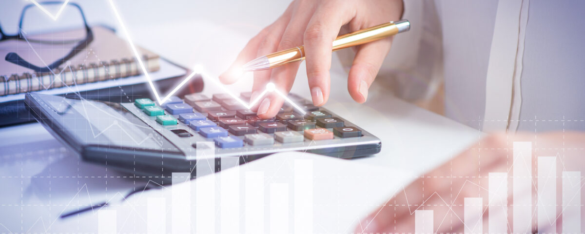 Accountant calculating profit with financial analysis graphs. Notebook, glasses and calculator lying on desk. Accountancy concept. Cropped view.